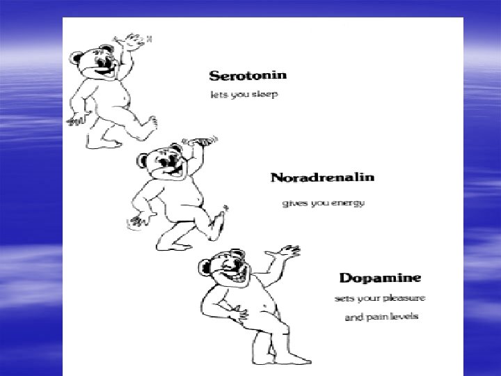 EFFECTS OF OVERSTRESS § OVERSTRESS is caused by brain CHEMICAL MALFUNCTION. § Trillions of messages are sent and received by the brain. § The messages that are happy, are carried by the brain's "HAPPY MESSENGERS" (technically known as Biogenic Amine/Endorphin System). § Other messages are somber and quieting. They are carried by the brain's "SAD MESSENGERS".
