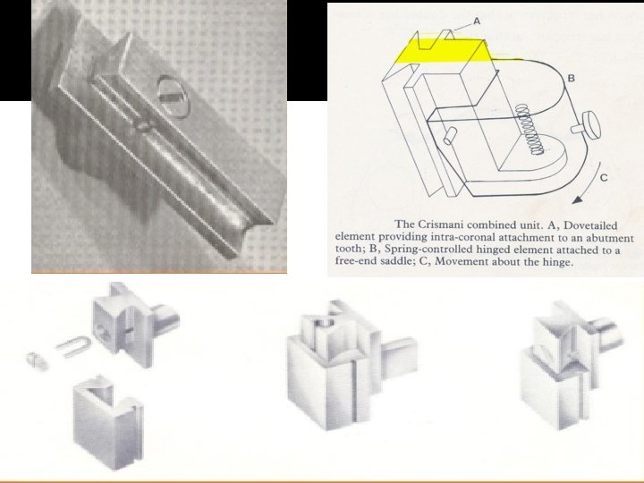 �E. g: the Swiss made Dalbo attachment and the Crismani attachment. � If the device works on a ball and socket principle, movement of the base is allowed in all planes and the tooth is relieved of all stress.