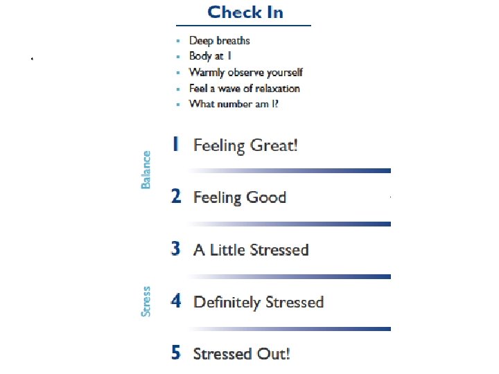 Brain States To figure out what brain state you are in, I am going to ask you about how you have been doing with your stress over the last month. You will give yourself a number corresponding to how you are doing. In the last month-How often have you felt these different brain states? Brain State 1 Feeling great-feeling balanced and rewarded with surges of pleasure in your body 0 -Rarely 1 -Sometimes 2 -Often 3 Very Often Brain State 2 Feeling good being present and aware of your balanced positive and negative feelings 0 -Rarely 1 -Sometimes 2 -Often 3 Very Often Brain State 3 A little stressed-feeling mainly negative feelings being somewhat numb and thinking too much 3 Rarely 2 -Sometimes 1 -Often 0 Very Often Brain State 4 Definitely stressed- Feeling negative, unbalanced, feelings having expectations that are too harsh. 3= Rarely 2 Sometimes 1= often 0= very often Brain State 5 Stressed out-overwhelmed confused, lost or disconnected 3 -Rarely 2 Sometimes 1=often 0= Very Often Total up your number. The higher the score, the better you’re feeling