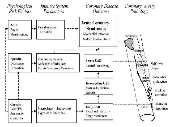 Type D and psychoneuroimmunological pathways Inflammatory processes play an important role in • atherosclerotic diseases. The pathophysiological mechanisms accounting for the • relationship between psychological factors and CAD progression may involve immunological processes. Psychological risk factors for CAD can be classified into three categories, based on their duration and temporal proximity to coronary syndromes: •