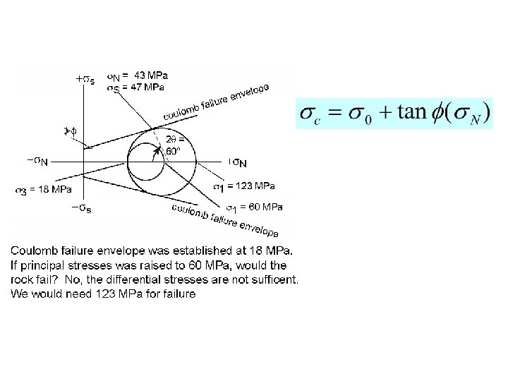 σc = σ0 + tan(φ)σn Formula defines shear stress under which rocks will fracture σc = critical shear stress — σs at failure σ0 = cohesive strength — σs when σn = 0 φ = angle of internal friction — φ ≈ 90 - 2θ