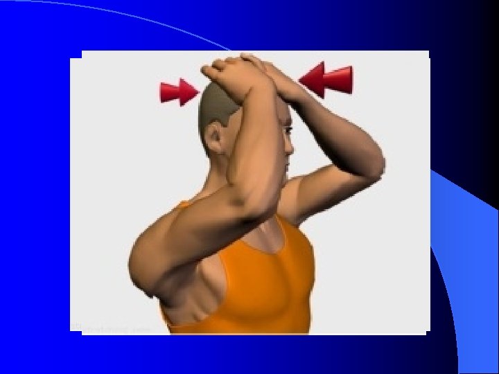 w dowolnej pozycji ugięte w łokciu ramię wsuwamy za głowę, drugą ręką pomagamy docisnąć l nie pochylamy głowy l