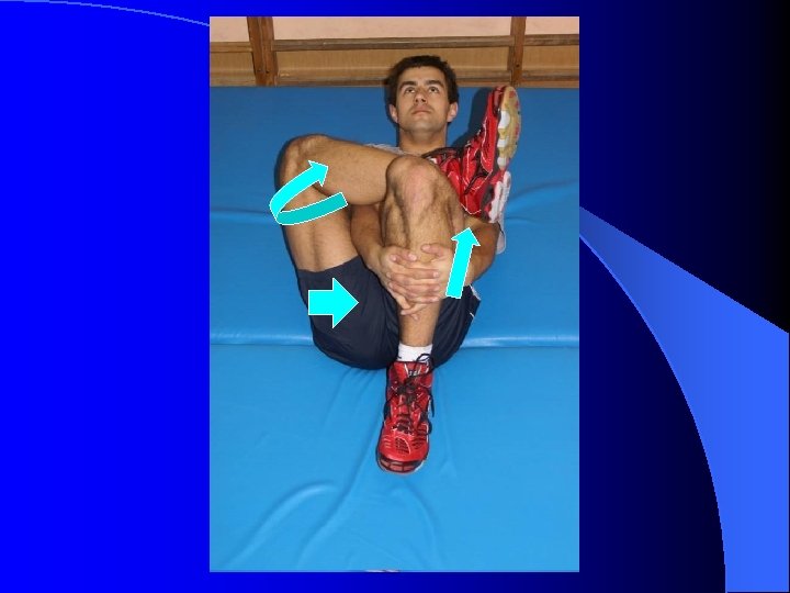 w siadzie „płotkarskim” ugnij w kolanach, do kąta prostego, nogę z przodu. Skręcaj tułów do nogi. l połóż się na plecach l połóż się do przodu l