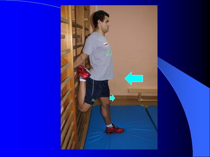 w klęku podpartym wysuń jedną nogę do przodu i pochylaj się nad nią l wysuwając stopę dalej do przodu zwiększaj wykrok i skłon do przodu l