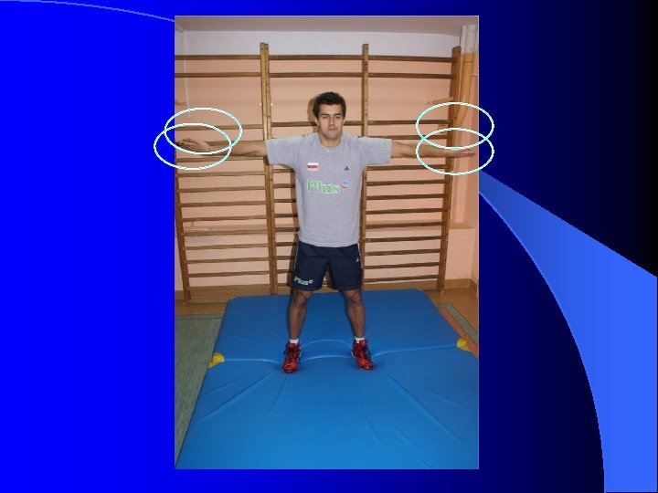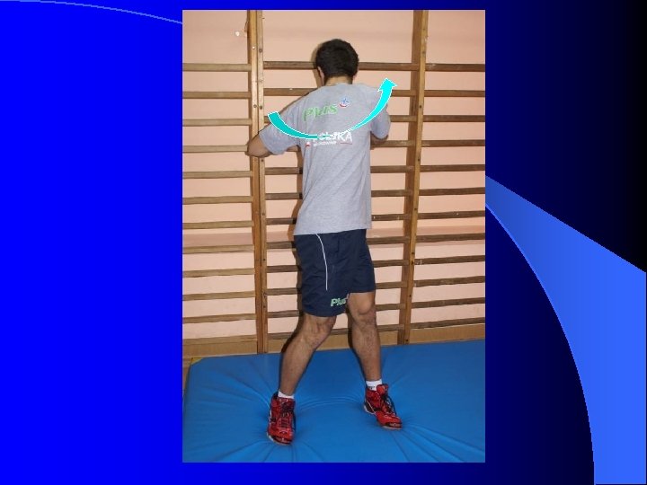 l W dowolnej pozycji (staniu, siedzeniu), prostą ręką dociskami do klatki piersiowej, ręką przeciwną pomagamy w dociskaniu