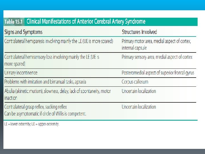 § Because the anterior communicating artery allows perfusion of the proximal anterior cerebral artery from either side, occlusion proximal to this point results in minimal deficit. More distal lesions produce more significant deficits. § The most common characteristic of ACA syndrome is contralateral hemiparesis and sensory loss with greater involvement of the lower extremity because the somatotopic organization of the medial aspect of the cortex includes the functional area for the lower extremity.