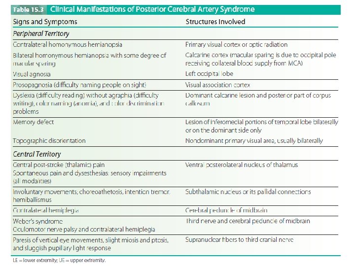§ Occlusion of thalamic branches may produce hemianesthesia (contralateral sensory loss) or central post-stroke (thalamic) pain. § Occipital infarction produces homonymous hemianopsia, visual agnosia, prosopagnosia, or, if bilateral, cortical blindness. § Temporal lobe ischemia results in amnesia (memory loss). § Involvement of subthalamic branches may involve subthalamic nucleus or its pallidal connections, producing a wide variety of deficits. § Contralateral hemiplegia occurs with involvement of the cerebral peduncle.
