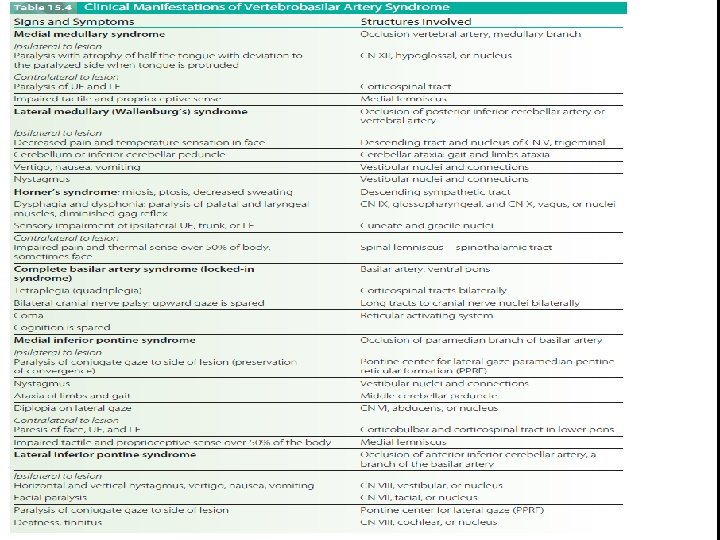 § Occlusions of the vertebrobasilar system can produce a wide variety of symptoms with both ipsilateral and contralateral signs, because some of the tracts in the brainstem will have crossed and others will not. § Numerous cerebellar and cranial nerve abnormalities also are present. § Locked-in syndrome (LIS) occurs with basilar artery thrombosis and bilateral infarction of the ventral pons. LIS is a catastrophic event with sudden onset.