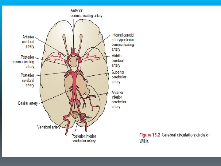 § Cerebral vascular anatomy is essential to understand the symptoms, diagnosis, and management of stroke. § Internal carotid artery § Vertebral artery (C 6) § Basilar artery § Anterior cerebral artery § Middle cerebral artery § Posterior communicating artery § Anterior communicating artery § Superior cerebellar artery § Inferior cerebellar artery § Anterior inferior cerebellar artery § Posterior inferior cerebellar artery