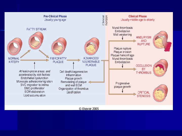 Summary of Atherosclerotic Process n n n n n Multifactorial process (risk factors) Initiated by endothelial dysfunction Up regulation of endothelial and leukocyte adhesion molecules Macrophage diapedesis LDL transcytosis LDL oxidation Foam cells Recruitment and proliferation of smooth muscle cells (synthesis of connective tissue proteins) Formation and organization of arterial thrombi