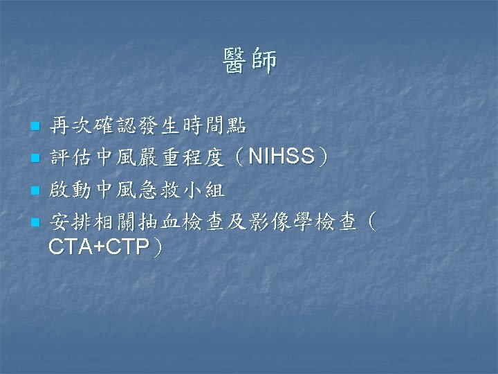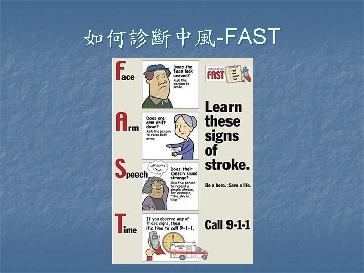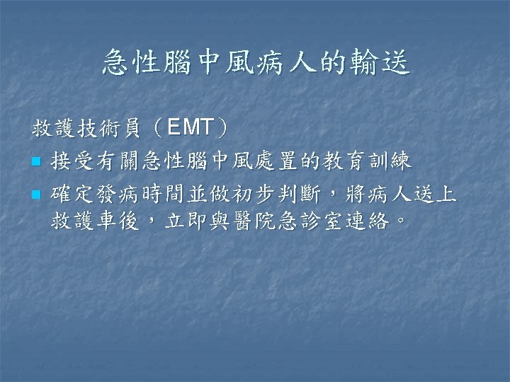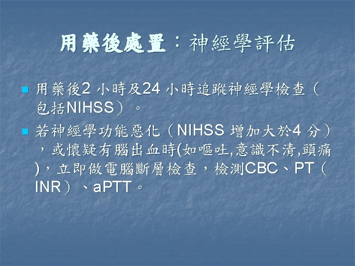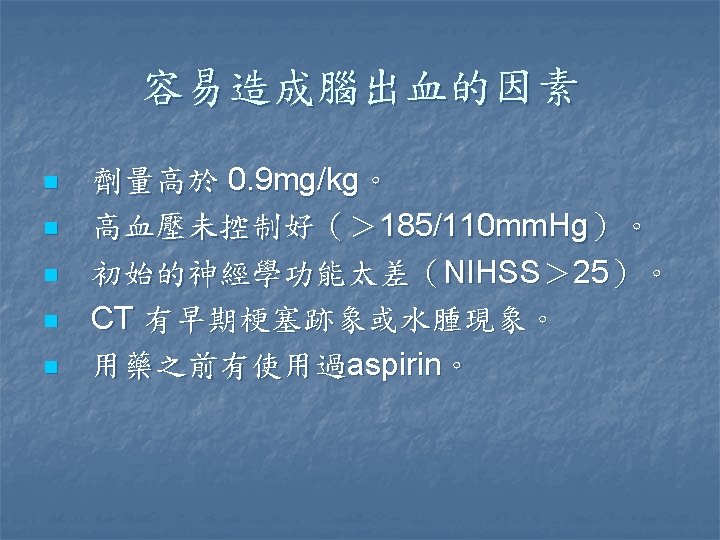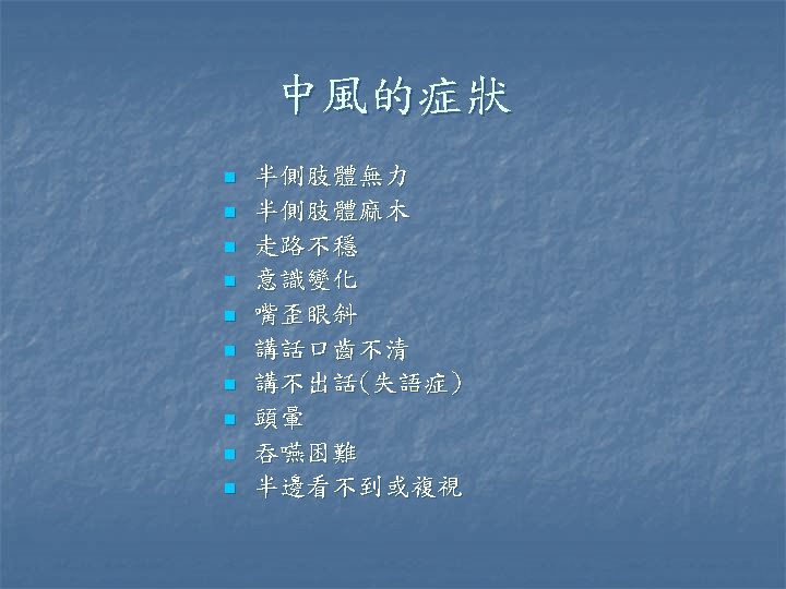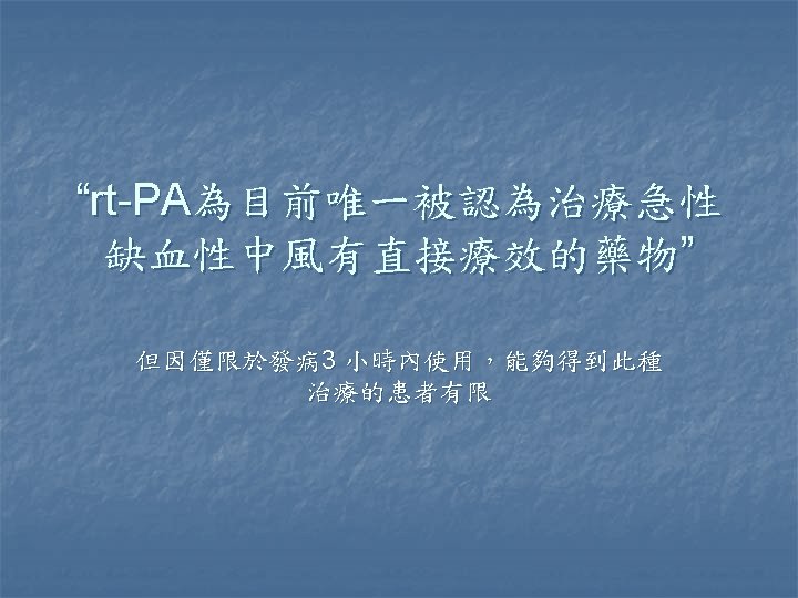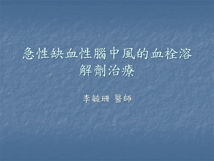 缺血性腦中風 n n 目前台灣地區最常見的腦中風型態 TOAST criteria Large artery n Small vessel occlusion n Cardiac embolism n Undetermined etiology n Other etiologies n