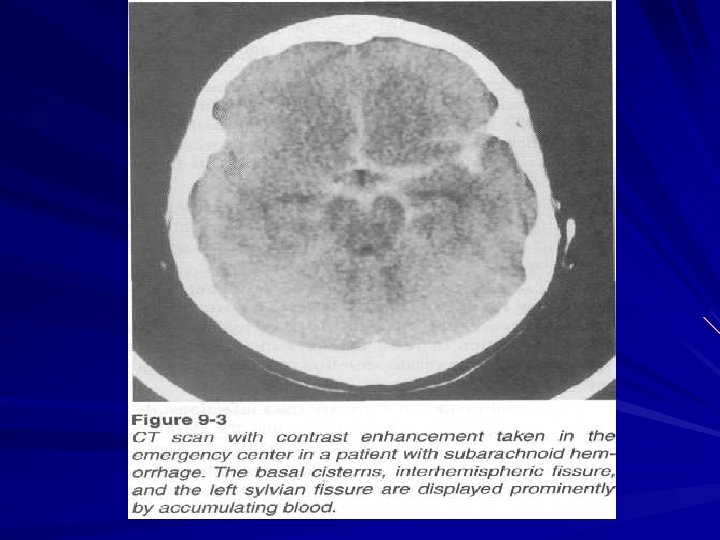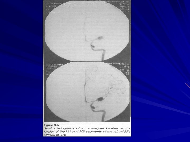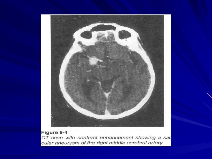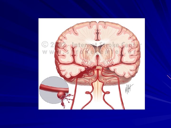 Subarachnoid hemorrhage Aetiologic factors: Aneurysmatic ( 50 – 62 % ) – aneurysm rupture. Hypertensive ( at hypertension ) Atherosclerotic ( 15 % ) Traumatic ( 5 – 6 % ) Infectious – toxic ( 8. 5 % ) Blastomatose ( at tumors ) Pathohemic ( at blood diseases ) Cryptogenic ( 4 – 4. 8 % )