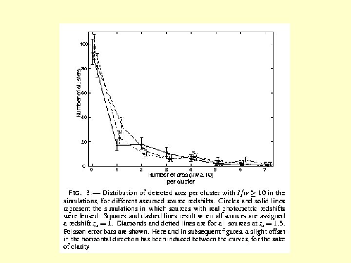 Bartelmann et al. (1998) : “Arc statistics”: Simulated LCDM clusters: Observed: • • • Observational studies: Zaritsky & Gonzalez (2003), Gladders et al. (2003) Recent: Sand et al. (2006) • • Theoretical studies: Meneghetti et al. (2000, 2003, 2005), Oguri et al. (2003), Wambsganss et al. (2004, 2005), Dalal et al. (2004), Tori et al. (2005), Puchwein et al. (2005). • Recent: Hennawi et al. (2005), Ho & White (2005), Li et al. (2005, 2006), Fedeli et al. (2006), Rozo et al. (2006)