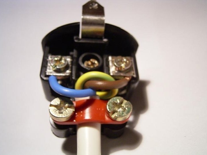 De randaardedraad komt bij deze stekker aan de zijkant, in de uitsparing, onder de schroefkop.
