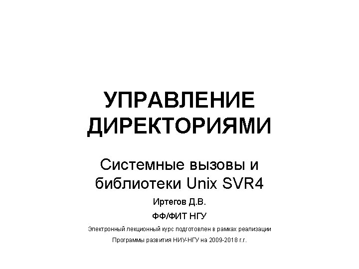 Чтение директории ИСПОЛЬЗОВАНИЕ #include <dirent. h> DIR *opendir(const char *filename); struct dirent *readdir(DIR *dirp); long teldir(DIR *dirp); void seekdir(DIR *dirp, long loc); void rewinddir(DIR *dirp); int closedir(DIR *dirp); ВОЗВРАЩАЕМОЕ ЗНАЧЕНИЕ успех – opendir, readdir - указатель на структуру closedir - 0 telldir - текущая позиция неуспех - opendir, readdir - NULL и errno установлена telldir, closedir - -1 и errno установлена