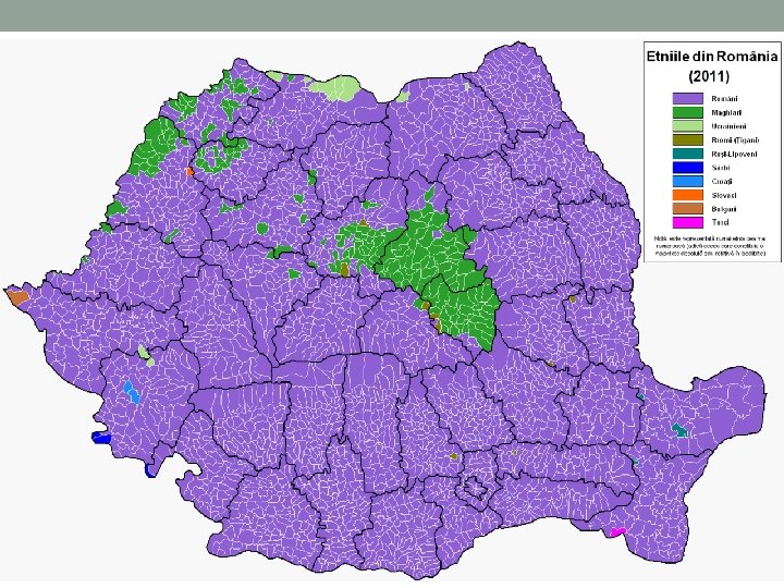 1. Structura etno-lingvistică Folosește drept criteriu de clasificare etnia (și limba maternă, asociată în mod obișnuit cu etnia). Populația României este alcătuită majoritar din români (cca 89%). Dintre etniile minoritare cele mai numeroase sunt cea maghiară (6, 5%) și cea rromă (3, 25%), urmați de un număr mult mai mic de germani, ucraineni, rușilipoveni, turci, tătari, sârbi, slovaci, bulgari, croați, greci, evrei, polonezi, italieni, armeni etc. În multe cazuri, etniile minoritare sunt concentrate în anumite regiuni ale țării: maghiarii în Transilvania (dominanți în județele Harghita și Covasna), germanii în sudul Transilvaniei și Banat, turcii și tătarii în Dobrogea, ucrainenii în Maramureș ș. a. m. d.