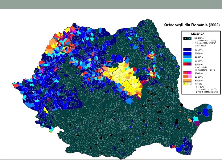 2. Structura confesională (religioasă) Clasifică locuitorii din România pe baza orientării religioase. Cea mai mare parte a românilor practică religia creștin-ortodoxă (cca 86, 5%). În afara acestora, numeroși sunt și romano-catolicii (4, 6%), reformații (3, 2%), penticostalii (2%), greco-catolicii (0, 8%), baptiștii (0, 6%) și musulmani (0, 3%).