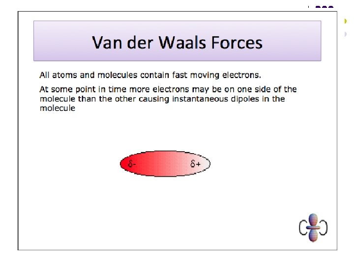 Van der Waals Forces l l These are the weak electrostatic forces of attraction between molecules where one end of a temporary dipole, set up in a molecule as a result of the fluctuating electron cloud, is attracted towards the opposite end of a dipole induced in a neighbouring molecule. Van der Waals forces are the only intermolecular force present in non-polar substances. Van der Waals forces increase in strength with increasing molecular size (i. e. increasing number of electrons per molecule). Van der Waals forces can also be affected by molecular shape – they increase in strength with increasing surface area of contact between molecules.