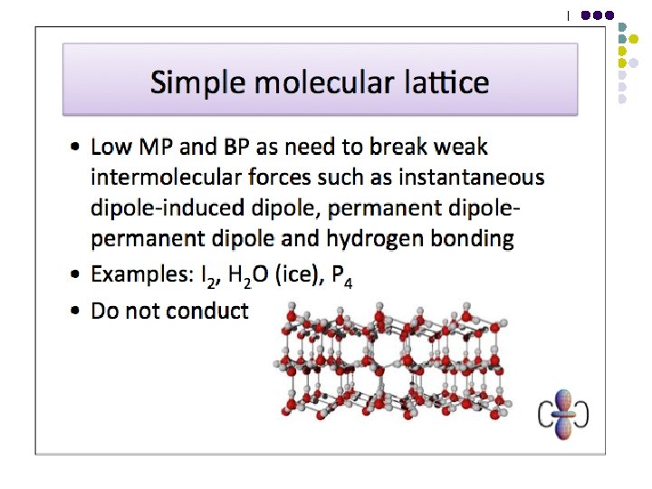 Bonding – Molecular Structures (simple molecules e. g. water, or big molecules e. g. polythene) These are characterised by having strong covalent bonds within their molecules but weak attractions between their molecules (i. e. weak intermolecular forces). l l SIMPLE MOLECULAR STRUCTURE Simple molecular structures have relatively low m. p. ’s and b. p. ’s Substances with big molecules e. g. polythene soften on heating as chains move over each other