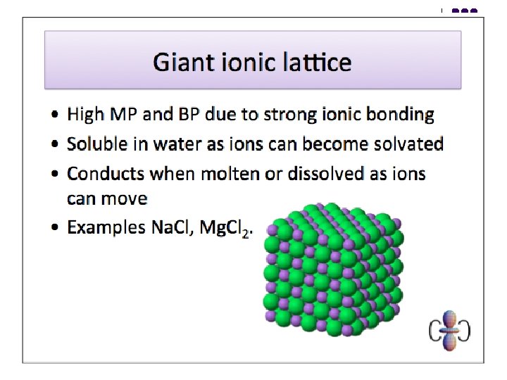 Bonding - Ionic An ionic bond is the electrostatic force of attraction between oppositely charged ions, formed as a result of complete electron transfer. l l Cl. GIANT IONIC STRUCTURE Na+ l Strong ionic bonds throughout High m. p. & b. p. Good electrical conductors when molten or in aqueous solution Soluble in polar solvents; insoluble in non-polar solvents Hard, brittle – may cleave along definite planes
