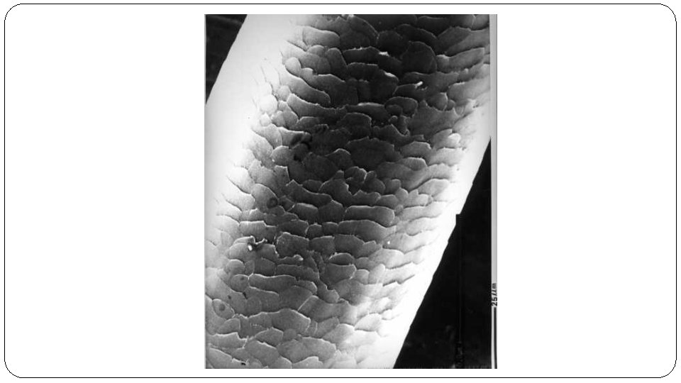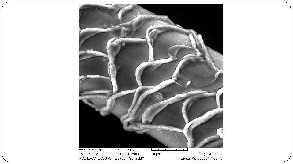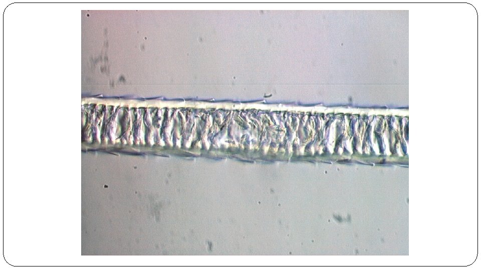 Structure of the Hair Shaft (cont. ) 2. Cortex – made up of keratin molecules, the pigment that gives hair its color. 3. Medulla – row of cells running along the center of the cortex which may appear dark or translucent depending on the presence of air, liquid, or pigment. Can be fragmentary, interrupted, continuous, or stacked. May not be visible in human hair. **In animals, it is at least 1/3 of the diameter of the hair.