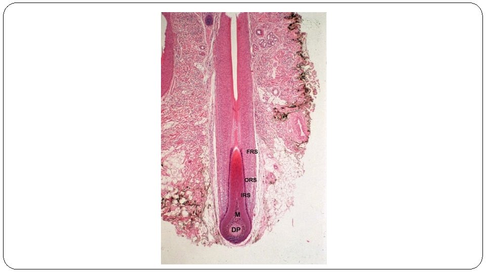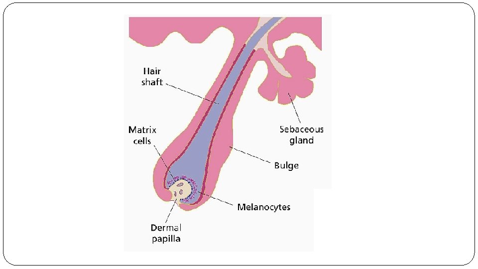 Structure 1. Follicle – tube like organ in the under layer of the dermis and is linked to the body’s blood supply 1. Papilla – indentation of follicle where blood vessels, nerves enter and exit 2. Matrix – area of cell division and hair growth 2. Root – portion of hair below the skin, embedded in the follicle