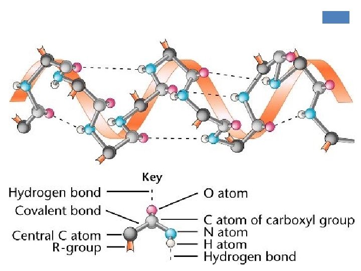 + Secondary Structure n Regions of a peptide chain that are coiled or folded into patterns n Regulated by H bonding of atoms in the peptide backbone n α-Helix n β-sheets