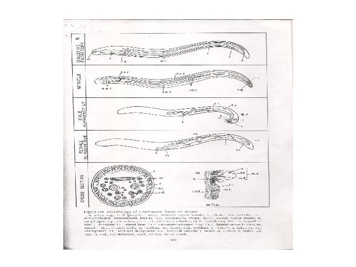 2. NEMATODES (ROUNDWORMS) • The nematode include numerous free-living and parasitic species. The free- living forms are widely distributed in water and soil. The parasitic species live in plants, snails, arthropods & vertebrates. It is estimated that more than 80, 000 species are parasites of vertebrates. v The species parasitic in humans range in length from 2 mm to more than a meter. v The sexes are separate. The male is smaller than the female, having a curved posterior end. ***