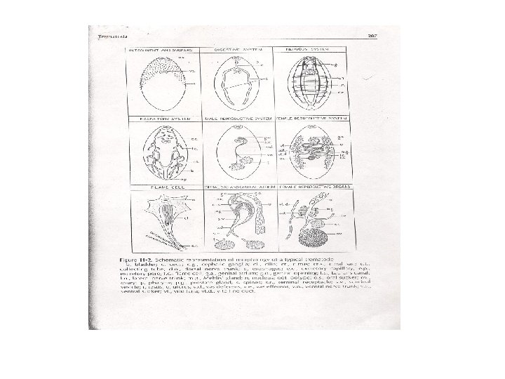 4. TREMATODA (FLUKES) ¨ Adult trematodes are usually flat, elongated leaf shaped, ovoid, conical, or cylindrical. They vary in size from less than 1 mm to several centimeters. The worm is enveloped by a noncellular integument which is covered with spines or ridges. The integument plays an important role in the absorption of carbohydrate. The worms are attached to the host by cupshaped muscular suckers with spines or hook. ¨ A muscular pharynx extends from the mouth in the oral sucker to a short narrow esophagus.