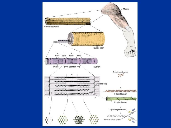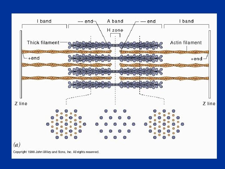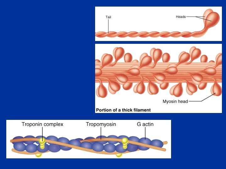 Les myofilaments au milieu des filaments fins d’actine, s’intercalent les filaments épais de myosine n Les filaments d’actine sont solidement fixés aux stries Z n Les filaments épais sont formés par l’assemblage de plusieurs molécules de myosine n