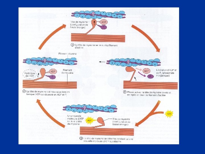 d- Mouvement de glissement des myofilaments n n n l’accouplement de l’actine et de la myosine dégradation d’ATP production d’énergie Cette énergie est convertie en mouvement de la tête de chaque molécule de myosine, qui, ensembles, donnent un micromouvement de glissement des filaments d’actine vers le centre du sarcomère. Sur leur lancée, les têtes de myosine se détachent des sites où elles étaient fixées et vont cher d’autres sites voisins pour à nouveau les faire glisser