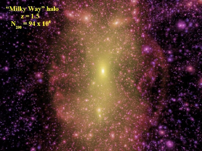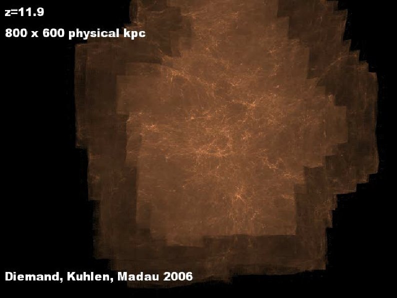 Formation of structures in the high redshift universe - I Main results found recently: Typical first generation haloes are similar in mass to the free-streaming mass limit (Earth mass or below) They form at high redshift (universe is denser) and are thus dense and resistant to later tidal disruption The mass is primarily in small haloes at z>20 Structure builds up from small mass (Earth like) to large (e. g. MW) by a subsequence of mergers