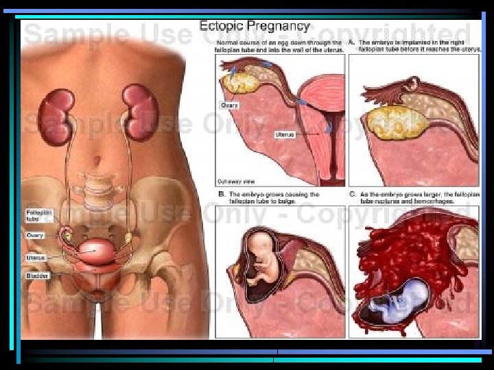 Ectopic Pregnancy • Implantation occurs outside of the endometrium in the uterus • 95% of time in a fallopian tube • 5% of time in an ovary • Fetus is surgically removed unless spontaneous abortion occurs • More common in smokers and women with many sexual partners