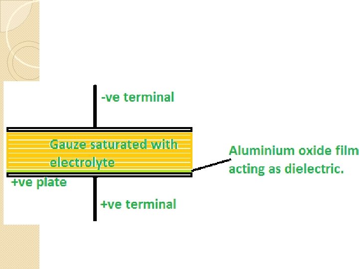 �A positive plate made up of Aluminium �An extremely thin insulating film of Aluminium oxide as dielectric which is electrochemically deposited in the surface of positive Aluminium plate itself. �An electrolyte of borax or carbon salt which is absorbed by a absorbent gauze which is placed in contact with the dielectric and connected to an external Aluminium lead acting as negative lead.