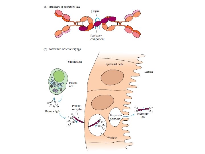 • Constitute 10 -15 % of serum globulins • Present in external secretions such as breast milk, saliva, tears and mucous • Occurs in monomeric form in the serum and dimeric or trimeric form in external secretions • Inhibits viral infections and bacterial colonization • Brest milk help protect the new born during first month of life • Mol wt. 1, 50, 000 -6, 000