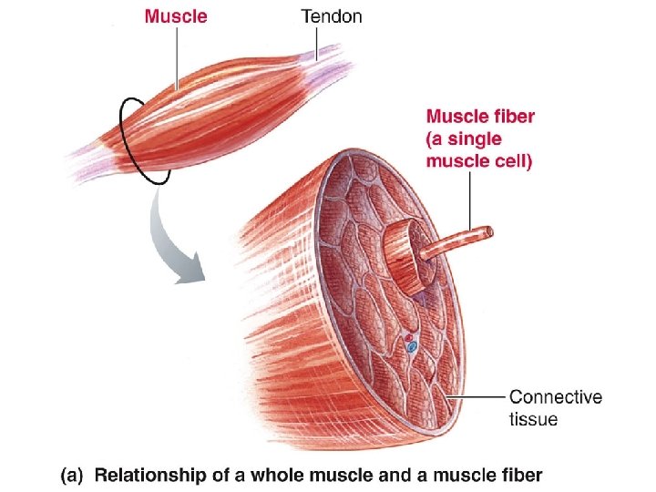Structure of Skeletal Muscle • Skeletal muscle consists a number of muscle fibers lying parallel to one another and held together by connective tissue • Single skeletal muscle cell is known as a muscle fiber – Multinucleated – Large, elongated, and cylindrically shaped – Fibers usually extend entire length of muscle