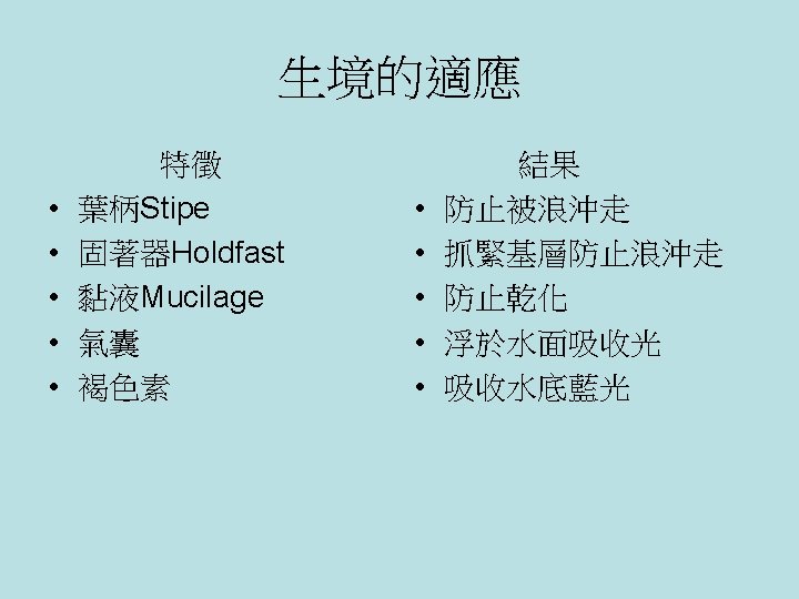岩藻生境 -rocky shore(in a short period of time) -intertidal zone 墨角藻 巨藻 Living Environment -岩岸(不能長時間逗留) -潮間帶