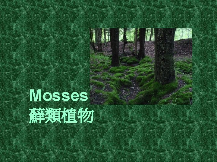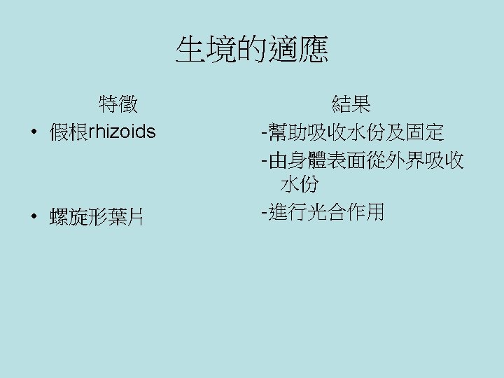 Living Environment Damp and shady areas -require water for reproduction -absorb water as well as minerals directly through their body surfaces 蘚的生境 潮濕陰暗的地方 -以水作為繁殖媒介 -靠身體表面吸收水份和礦物質 -沒有角質層減少水份流失 Moss (蘚)