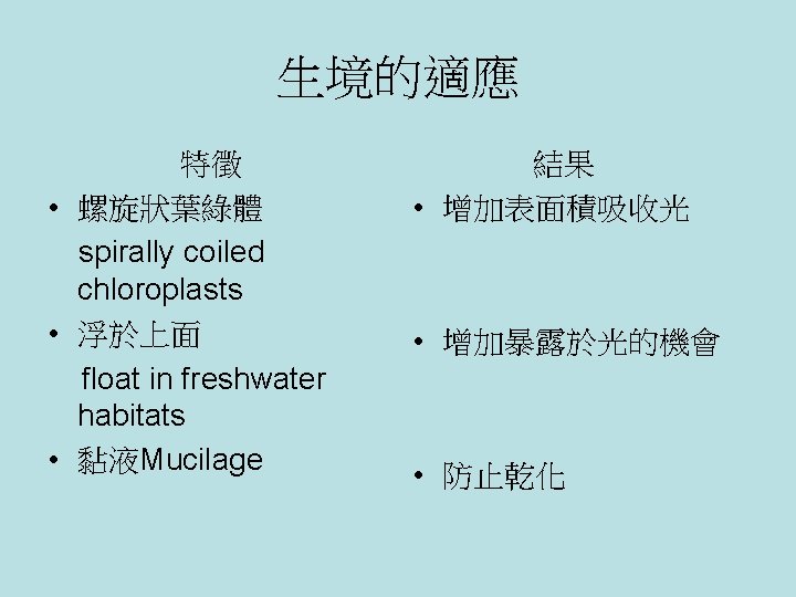 水綿生境 浮在淡水之水面上(如 池塘.湖泊等) Spirogyra (水綿) Living Environment float in freshwater habitats (e. g. ponds, lakes, etc. )