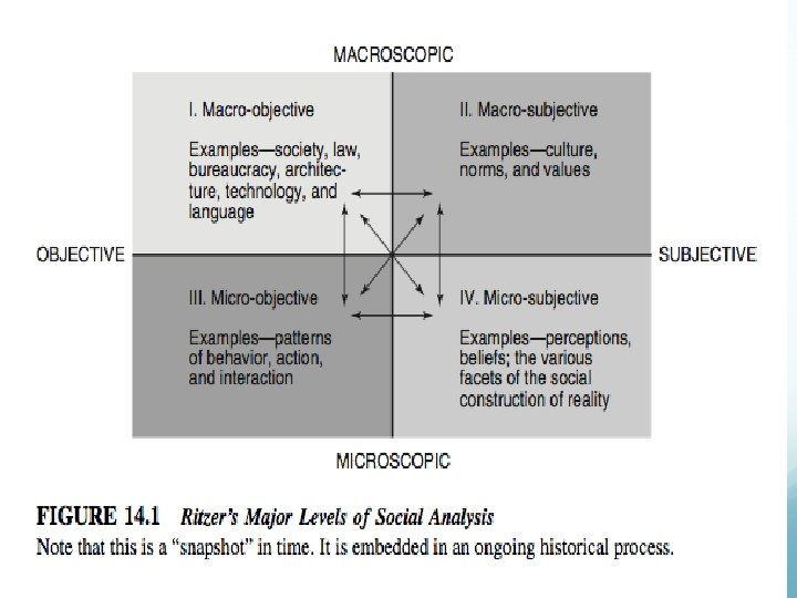 Examples of Micro and Macro Integration All micro and macro social phenomena are also either objective or subjective. Focus on the interrelationship among these 4 levels. The macro-objective level involves large-scale material realities such as society, bureaucracy, and technology. The macro-subjective level encompasses large-scale nonmaterial phenomena such as norms and values. The micro objectivity involves small-scale objective entities such as patterns of action and interaction, whereas The micro subjectivity is concerned with the small-scale mental processes by which people construct social reality.