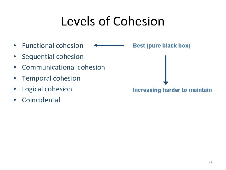 Levels of Cohesion • • • Functional cohesion Sequential cohesion Communicational cohesion Temporal cohesion Logical cohesion Coincidental Best (pure black box) Increasing harder to maintain 24