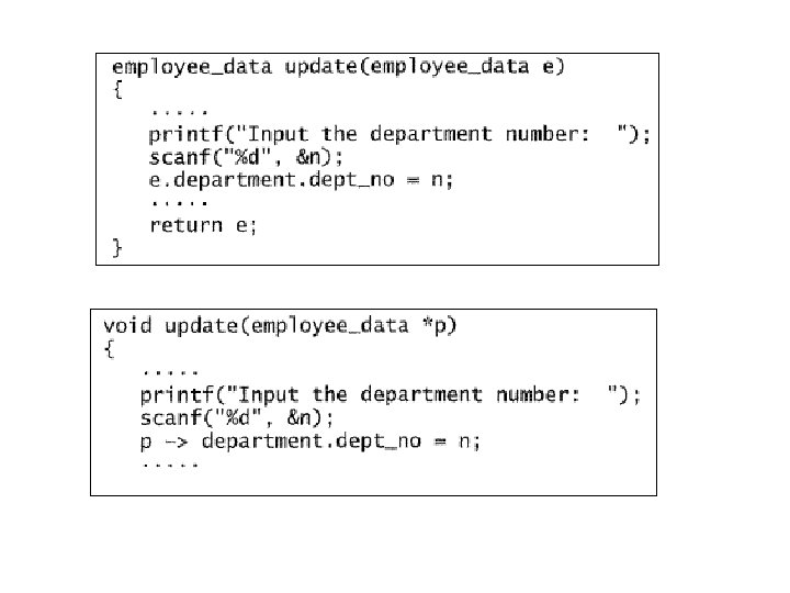 • to write a function to update employee information 1. pass a structure 2. pass a pointer to structure (this is more efficient because. . . )