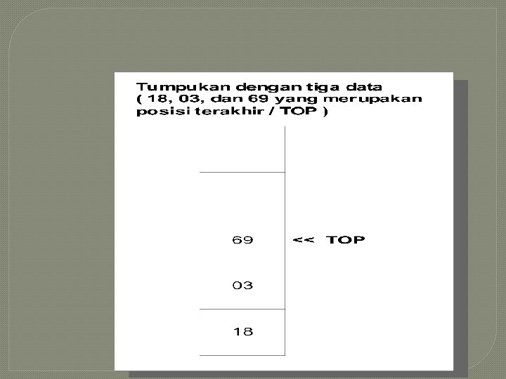 Contoh Struktur Data …. . • Struktur Data Statis – array/larik , rekord, himpunan. • Struktur Data Dinamis - list/senarai, queue /antrian /giliran, tumpukan /stack /timbunan, pohon, graf.