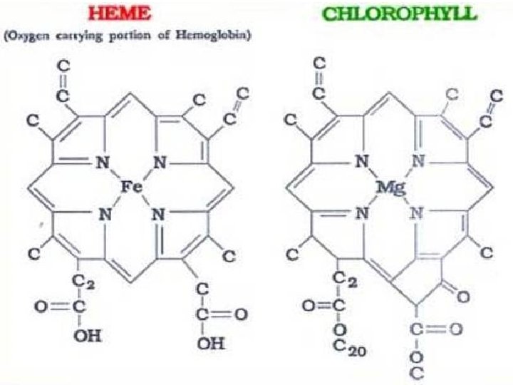 Chlorofil Secara kimia Klorofil memiliki struktur yang serupa dengan sel darah merah manusia (hemoglobin), hanya berbeda pada pusat atomnya yang berupa magnesium (Mg), sedangkan pada darah manusia adalah zat besi (Fe). Kesamaan struktur inilah yang membuat klorofil bisa bekerja secara efektif di dalam darah manusia & tidak dianggap "benda asing".