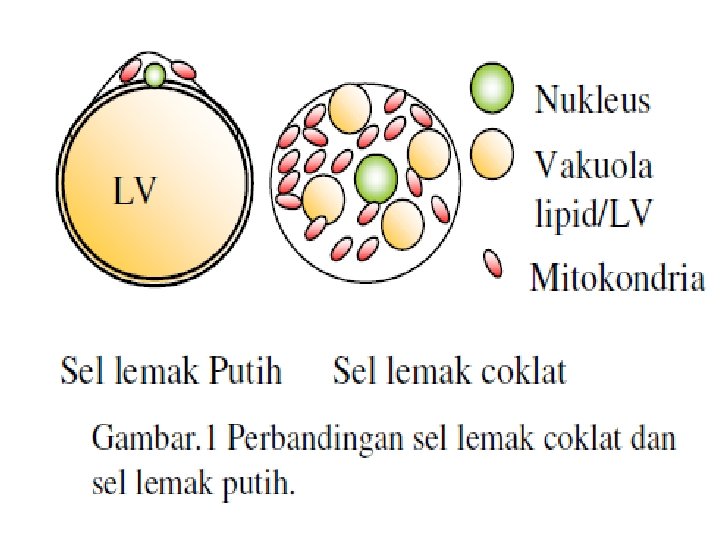 2. Sel lemak coklat berisi glikogen dan banyak mengandung mitokondria dengan multipel cristae untuk menghasilkan bahan bakar dan energi yang dibutuhkan guna produksi panas dengan cepat, sedangkan sel lemak putih tidak berisi glikogen dan mitokondria relatif sedikit (Davis, 1980, Astrup, 1986 ).