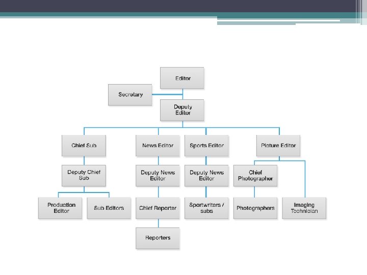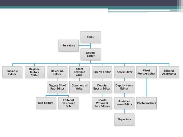 • Pemimpin redaksi : ▫ Orang yang memiliki otoritas tertinggi. ▫ Bertanggung jawab menjalankan organisasi keredaksian sehari-hari, dan pada kondisi tertentu tetap menjalankan fungsi kewartawanan dalam porsi yang disesuaikan. Bertugas melakukan pengawasan dan pembinaan pada unit kerja yang berada di bawahnya (redaktur pelaksana, koordinator peliputan, manajer produksi, para redaktur, wartawan, layouter, design grafis, hingga tenaga pracetak. ▫ Bertanggung jawab pada pemimpin umum. • Secara garis komando, koordinator peliputan berada setingkat dengan manajer produksi. Keduanya bertanggungjawab pada redaktur pelaksana. • Koordinator peliputan membawahi redaktur dan wartawan. • Redaktur, membawahi wartawan, baik itu wartawan tulis maupun wartawan foto.