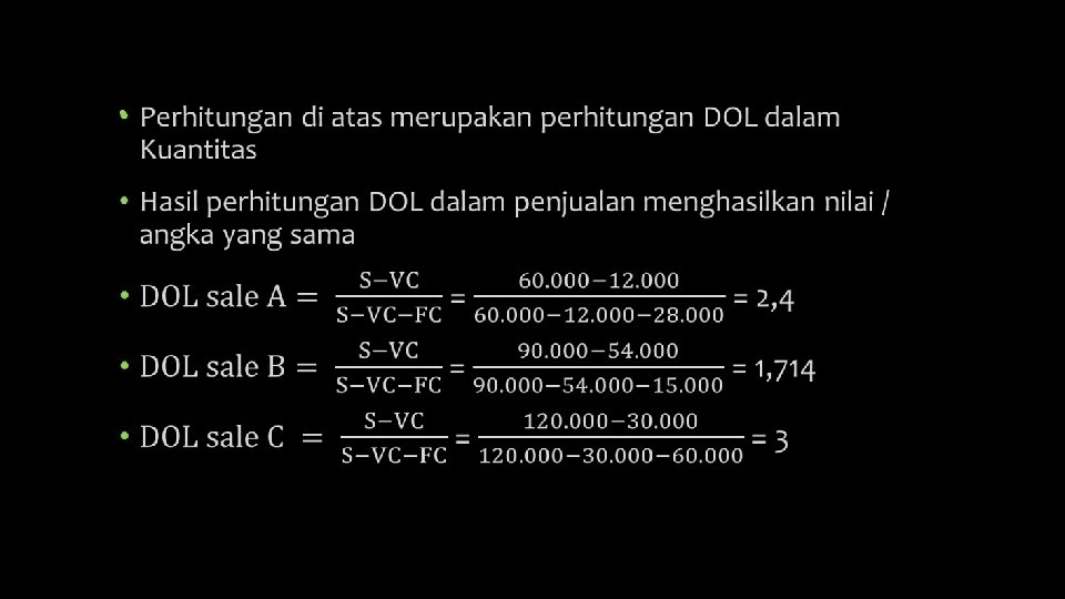 Diketahui Laporan Laba Rugi Perusahaan A, B, dan C (dalam $ 000) Keterangan Perush. A Perush. B Perush. C Penjualan 60. 000 90. 000 120. 000 Biaya Variabel 12. 000 54. 000 30. 000 Marjin Kontribusi 48. 000 36. 000 90. 000 Biaya Tetap 28. 000 15. 000 60. 000 EBIT 20. 000 15. 000 40. 000 Harga per Unit 100 100 Sales Volume (unit) 600 900 1. 200 Biaya Variabel per unit 20 60 25 Q(P-VC) 600(100 -20) > DOL A = --------------------- = 2, 4 Q(P-VC)-FC 600(100 -20)-28. 000 900( 100 -60) >DOL B = ----------------900 ( 100 -60) – 15. 000 = 1, 714 1. 200 ( 100 – 25) >DOL C = ------------------- = 3. 1. 200 (100 – 25) – 60. 000