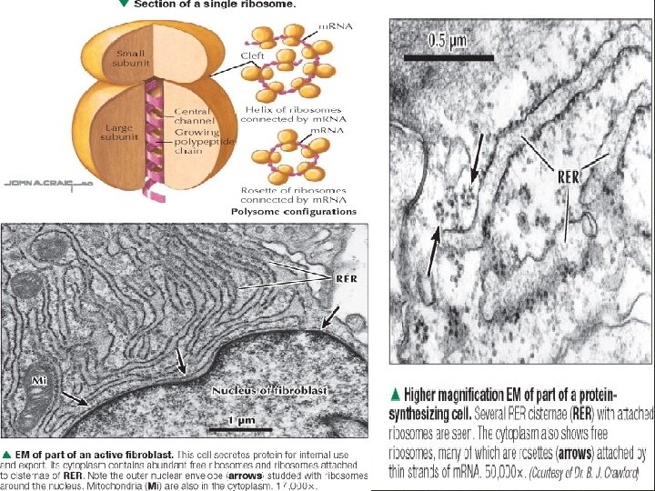 RIBOSOM q Merupakan organel yang tidak bermembran q. Tersusun : RNA & protein. q. Fungsi : sintesis protein pada translasi q. Terdapat : individu atau kelompok (polisom) dengan melekat pada RER atau bebas dalam sitosol : → polisom pada RER berfungsi sintesis protein yang eksositosis atau yang ke lisosom → polisom bebas berfungsi sintesis protein intraseluler q. Protein (80 S) : → sub unit besar (60 S) : 26 S ; 5 S & 5, 8 S r. RNA → sub unit kecil (40 S) : 18 S RNA q. Disintesis dalam nukleolus