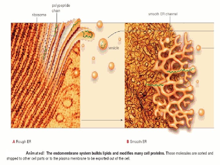 RETIKULUM ENDOPLASMA q Merupakan sistem sitomembran sisterna kontinu dari inti → ke membran sel q. Terdiri : SER & RER q. Fungsi : → SER : detoksifikasi & sintesis lipid (termasuk steroid) : fosfolipid dan kolesterol (penting untuk pergantian biomembran) → transportnya dengan vesikel transport atau protein pentransfer fosfolipid → RER : sintesis protein seperti antibodi q. Bermembran → sistem tertutup & terpisah dari sitosol → sisterna & lumen q. Protein dari polisom pada RER : protein transmembran atau exportable protein → masuk ke ruang-ruang sisterna hingga tujuan akhir q. Protein dari ribosom bebas → tetap di sitosol atau ke bagian lain atau mitokhondria atau nukleus