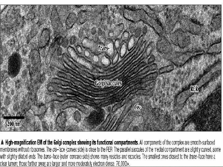 Pembagian daerah-daerah fungsional Golgi. CGN, TGN dan sisterna Golgi (cis, medial dan trans) mengandung enzim-enzim yang terlibat pada fungsi Golgi yang spesifik. Arah transport adalah dari RER CGN cis sisterna medial sisterna trans sisternae TGN. Protein RER mengandung signal KDEL (Lys-Asp-Glu. Leu) yang dihasilkan saat kembali ke RER.